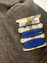 La restauration de la veste "My Fair Lady" a été réalisée avec des Laines Saint Pierre vintage et des pièces prélevées sur des vêtements de seconde main déclassés, achetés chez Emmaüs lors d'une vente au kilo.